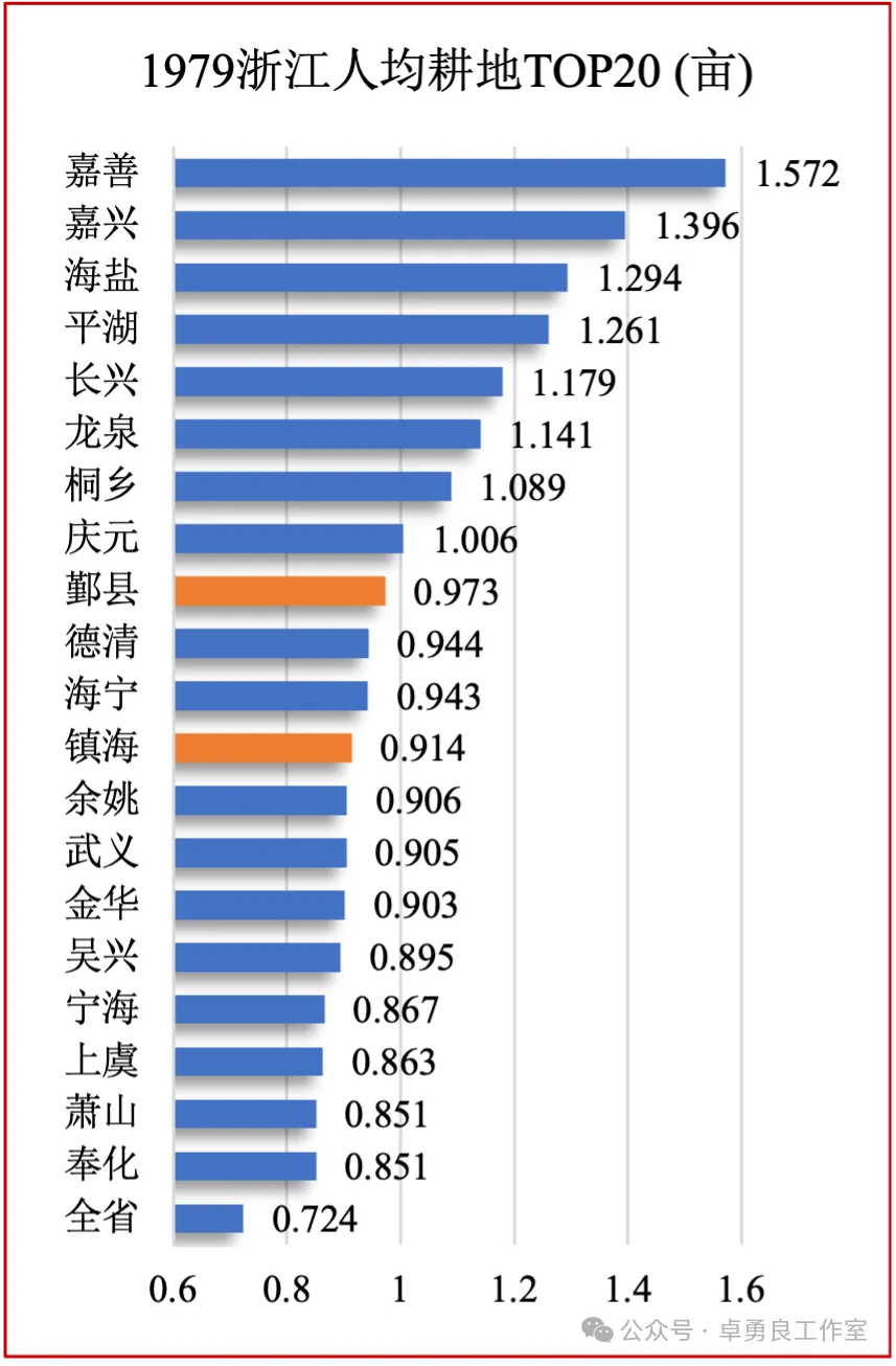 关于这场大迁徙,也能从后来镇鄞人均耕地居全省较前位次得到证实。1979年,镇海人均耕地0.914亩,鄞县0.973亩,均大大高于当时全省平均的0.724亩。